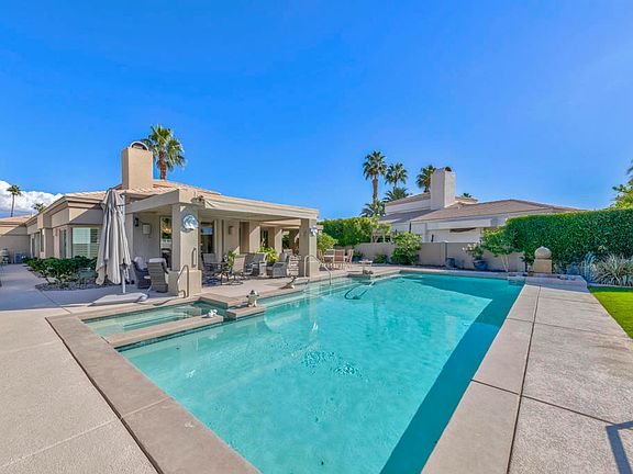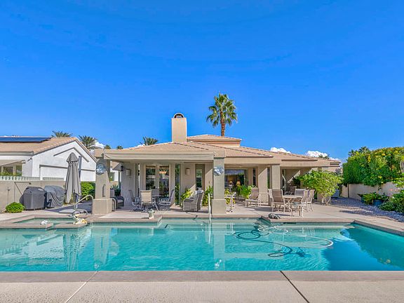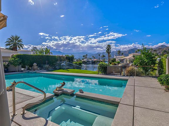 Located on the scenic shores of Lake La Quinta, this property represents a unique opportunity within an esteemed community. Upon entering the secure, 24-hour guard-gated enclave, residents will appreciate the tranquil atmosphere and sense of peace on earth. The setting features a 25-acre man-made lake, diverse wildlife, panoramic mountain views of the Santa Rosa range, and access to amenities including community tennis and pickleball courts, a heated community pool, bocce ball, and two electric boats for resident use.This meticulously maintained residence encompasses 3,188 square feet of living space, offering three bedrooms, three and a half bathrooms, and a three-car garage--one bay has been converted into a generously sized enclosed storage area or office. Expansive views are enjoyed from the main living area and primary suite. The home also features an impressive bar area, breakfast nook, and a well-appointed kitchen, providing exceptional spaces for entertaining. The third bedroom is currently configured as an office. Additional features include a private front courtyard, mature landscaping including an impressive grapefruit tree and southwest-facing backyard with a beautiful saltwater pool and spa, extensive covered patio space, and your own boat dock! Too many amenities to list, come see this beautiful home & community before its gone!