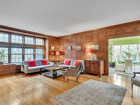 This impressive custom-built 1920s Tudor, designed by H. Davidson, boasts a striking presence with its brick exterior and triple slate roof. Lavish proportions and exceptional woodwork showcase distinctive architectural details throughout. Inside, gleaming wood floors and tall ceilings enhance the grand spaces perfect for entertaining. The first floor features a cozy library, an expansive living room anchored by an oversized wood-burning fireplace, and a solarium that opens to private gardens perfect for alfresco dining. The formal dining room flows seamlessly from the spacious renovated kitchen. Upstairs, the generous primary suite is a serene & relaxing retreat with an en-suite bath, a walk-in closet and fireplace. Five additional bedrooms and two additional family baths. An attached two-car garage includes an additional living area with a bathroom, perfect space for an au pair. Located near the C and D lines, this home is close to all the urban amenities Brookline has to offer.