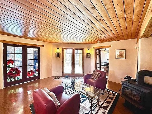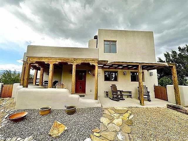 This beautiful Pueblo-style home is located in the beautiful Ojo Sarco valley. It boasts over 4 acres of land and backs up to Carson National Forest. The interior is spacious and thoughtfully designed, featuring exquisite cabinetry, custom tile work, and elegant finishes. The main level boasts an open concept living room and kitchen, complemented by a separate dining area, perfect for entertaining. A well-appointed bedroom with an ensuite bathroom showcases beautiful tile finishes, ensuring comfort and style. Upstairs, you'll find an inviting second living area, an additional bedroom, and the luxurious primary suite, complete with a large closet. Step out from the primary bedroom onto the covered balcony, with beautiful views of the Ojo Sarco Valley and Truchas Peak. The oversized carport and versatile workshop add functional space for your hobbies and outdoor pursuits. This property is located just about 45 minutes from Taos, 20 minutes from the Sipapu Ski Resort, and about an hour from Los Alamos and Santa Fe.