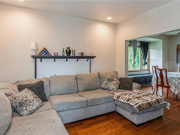Living Room: Welcoming space with recessed lighting, newer flooring, and a white brick fireplace.