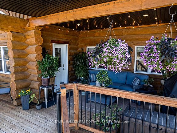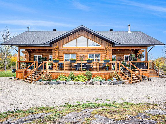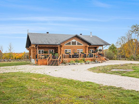 Set along a quiet country road that winds through forest and meadow, this modern log home rests on 2.6 acres near Bennett Lake. Surrounded by a cedar rail fence and open fields, it feels timeless and secluded, with only the soft presence of grazing cattle beyond. The back deck looks across meadow and forest, a perfect vantage for watching mist lift in the morning or autumn colour settle over the treeline. Out front, the verandah invites long evenings with friends, or a quiet soak in the hot tub beneath sunsets and stars. Inside, the home combines the warmth of exposed logs with an open, airy layout rarely seen in traditional log homes. The living room features hardwood floors, a cathedral ceiling, and tall windows that capture soft afternoon light. The kitchen is modern and welcoming, with updated appliances and a large island that's made for sharing meals and conversations. The main floor primary bedroom greets the morning sun and includes a recently added walk-in closet with built-in shelving. Downstairs, the walkout lower level offers ceramic tile floors, radiant heat, pot lights, two more bedrooms, a full bath, and a spacious family or rec room. With its own entrance, its ideal for guests, extended family, or a potential in-law suite. Recent updates include designer lighting, a new wood stove, commercial-grade washer and dryer, and a large Amish-built shed. Bennett Lake is just minutes away for swimming, paddling, and fishing. And for everything else, Perth is a quick 15-minute drive. This is country living with style, comfort, and space to breathe.