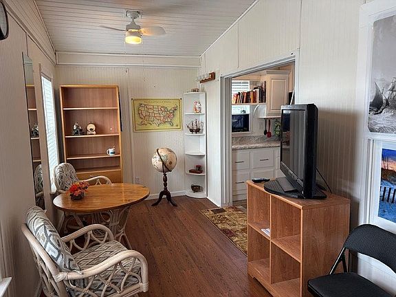 The home has 3 abreast parking spaces.There are storm shutters all around.Connected to the home is a 180 sq. ft. building with a work bench&storage bins in one area and a man cave in the other area.The back yard has a picnic table and 2 sheds and a storage container.The home has a bonus room which can be used as a 3rd bedroom.The home is furnished with 5 flat screen tv's connected to an antenna providing dozens of free channels.There is abundant storage and a breakfast bar separating the kitchen and living room.
