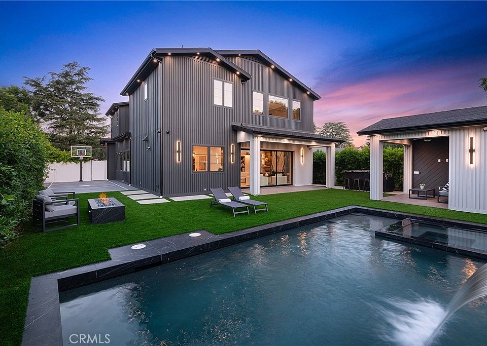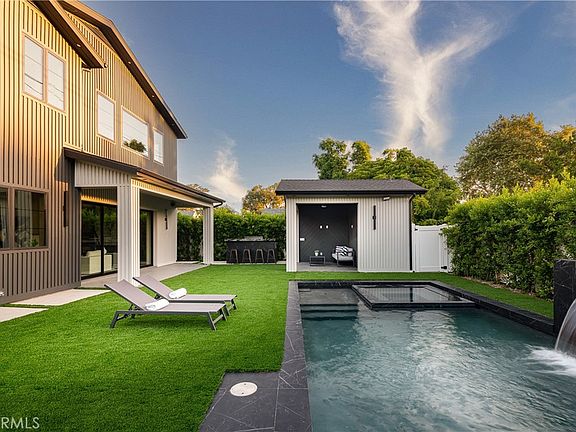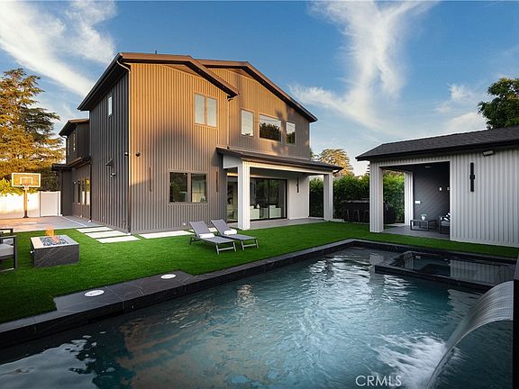 Spectacular gated new construction modern farmhouse in prime Sherman Oaks. This property offers seamless luxury and sophistication, boasting 5 bedrooms and 6.5 bathrooms. The wood-clad exterior and expansive front yard with a circular driveway, along with an incredible wood-slatted front door, set the tone for all that awaits within. The inviting great room is highlighted by a fireplace and a beamed ceiling. The heart of the home is the stunning kitchen, featuring Thermador appliances, custom cabinetry, and accent pendant lighting that further enhances the luxurious feel of the space. Attached is the family room, a true haven complete with custom bookshelves, a fireplace with bookmatched slabs, and sliding pocket doors that open to the outdoor paradise. Outside, you'll find an entertainer's paradise showcasing a dining patio, PebbleTec pool/spa with a baja shelf and waterfall feature, built-in barbecue, cabana, and pool bathroom. Additionally, the half-court basketball area adds an element of fun and recreation.