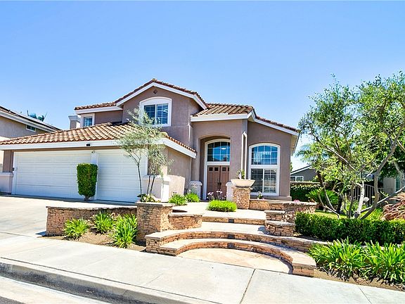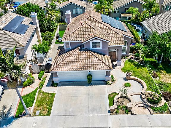 Lovely four bedroom, three bath pool home, located on a private cul-de-sac street in this highly desirable "Ridge at the Belmont" community. Double door entry leads to the living room with its high ceilings and large high windows allowing lots of light. The dining room is perfect for family meals and entertaining. You will love this kitchen which has been updated with a center island with seating, a large single basin sink, dishwasher, microwave, built in beverage cooler and much more. The family room opens to the kitchen area and has a gas fireplace. Downstair bedroom plus a downstairs bathroom which has a shower and lighted vanity mirror. The convenient inside separate laundry room has been updated with cabinets, clothes hanging rods, a sink and marble flooring. Upstairs is the master bedroom with high ceilings and a large master bathroom with separate tub and shower. The master bedroom also has two closet areas with built in storage. Upstairs there are two more bedrooms, a bathroom with a tub, shower, double sinks and a loft for the kids, or it can be used as an office. This backyard will be your family's oasis with the beautiful swimming pool that has a resort like baja ledge where you can play, relax or soak in the large spa. Spacious yard for entertaining with friends and family. Additional highlights include three car oversized garage with storage cabinets, solar panels and central air and heating. Great location in the hills of Orange. Don't miss this opportunity to make this beautiful home yours.