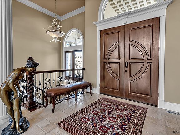 Guests will be greeted by the elegant foyer, travertine floors, soaring ceiling and grand fireplace. Several doors lead out to the balcony making entertaining a breeze. The stunning kitchen is a chefs dream with custom cabinetry, tops of the line appliances, pantries, and 2 islands. The family room with a coffered ceiling has a gas fireplace.