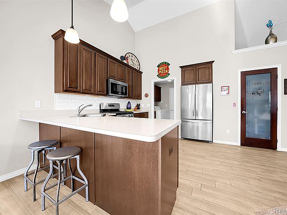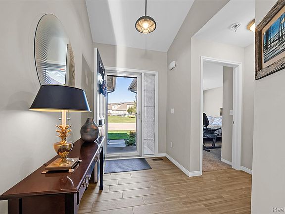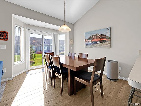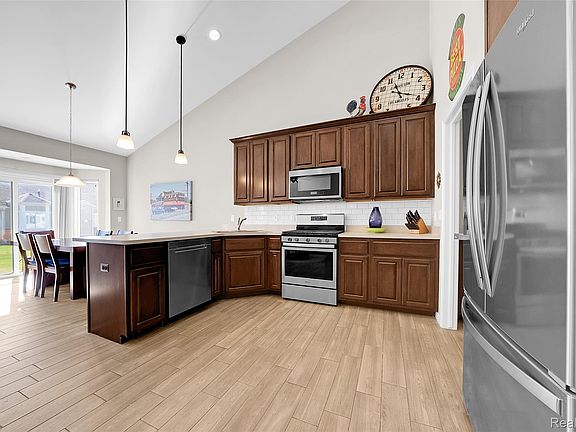 Inside, you’ll be welcomed by an open concept layout with soaring cathedral ceilings, a warm gas fireplace with custom mantel, and a sun-filled great room that invites relaxation and gatherings alike. The heart of the home—a gourmet kitchen—features stainless steel appliances, modern cabinetry, and seamless flow into the oversized dining area, where a bay doorwall opens to a patio oasis.