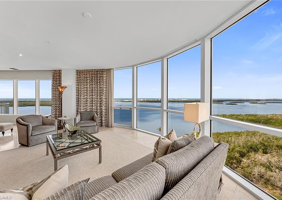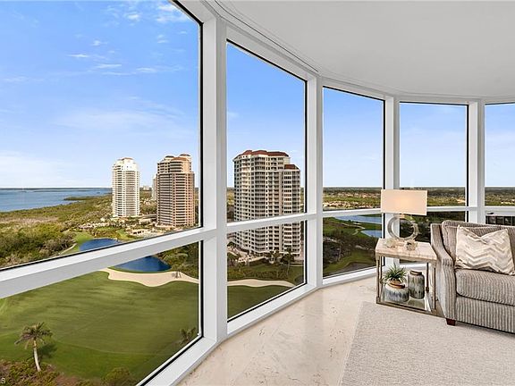 Experience sky-high luxury, masterfully designed to embrace breathtaking views in this sprawling 4,121-square-foot coveted "04" end residence in Horizons at Bonita Bay. From the shimmering waters of Estero Bay and the Gulf of Mexico to the lush nature preserves and championship golf course, every room is a front-row seat to unparalleled beauty. The three open terraces offer views of stunning sunrises and sunsets. Designed for grand entertaining and intimate gatherings, this residence features multiple living and dining areas that blend seamlessly within the open-concept layout. The updated kitchen showcases refaced cabinetry with a fresh, modern finish and brand-new appliances, including a refrigerator, oven/microwave, cooktop, dishwasher, and garbage disposal. The bright and airy primary ensuite bath is a private sanctuary, offering a soaking tub perfectly positioned to overlook the Gulf, a frameless glass shower entry, and finishes that elevate this spa-like retreat. The expansive bedrooms provide serene comfort, brimming with natural light. Designer custom closets offer impeccable organization. New electric hurricane shutters on all sliding glass doors provide security and peace of mind. Essential upgrades include a new water heater and air conditioners (2020/2021). Enhanced lighting, trim, and a Lutron lighting control system set the perfect ambiance, while app-controlled window treatments and sliding door/window tinting ensure privacy and efficiency. Additional enhancements extend to the guest baths and a refreshed laundry room, providing modern convenience throughout. Horizons at Bonita Bay, the Bonita Bay Club, and Bonita Bay Community Association offer an unparalleled lifestyle, with resort-style pools, a state-of-the-art fitness center, private beach access, championship golf, and more. Don’t miss your opportunity to own this masterpiece, view-inspired sanctuary where luxury and panoramic beauty converge.