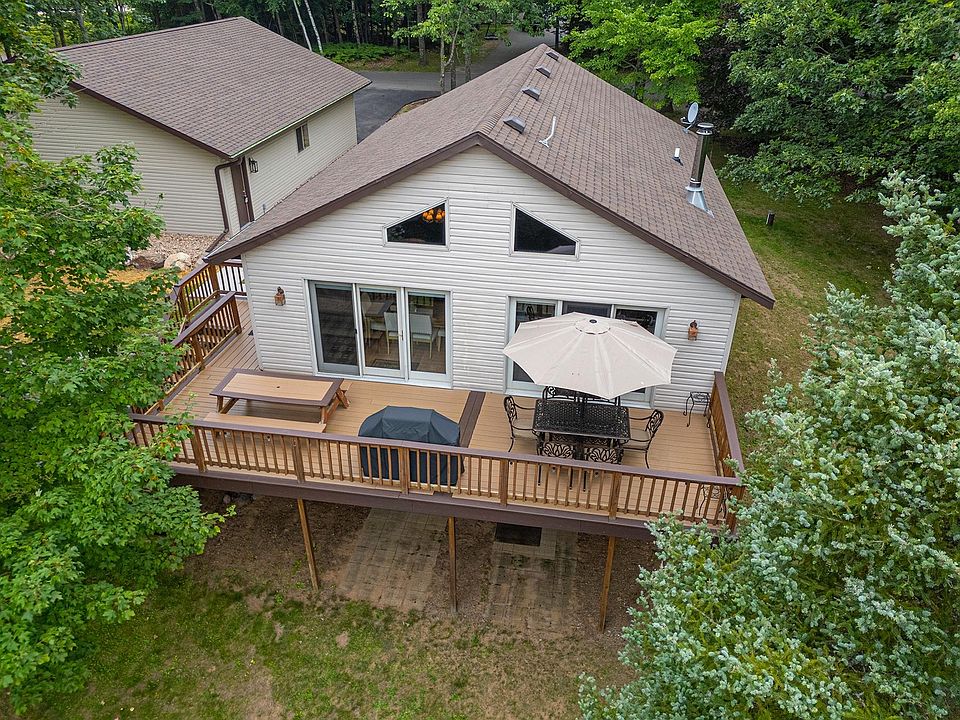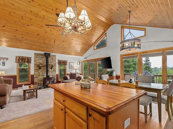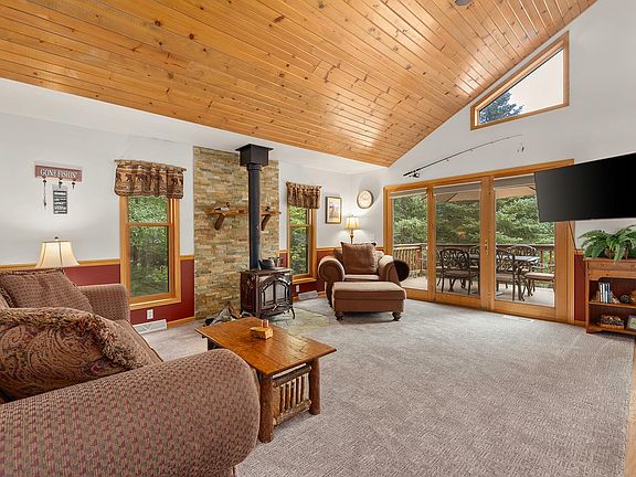 Chain Lake of the Sugar Camp Chain! Fully furnished 3 BD, 2 BA home w/ 101’ of frontage is located just into the channel off Chain Lake & provides year-round access to snowmobiling, ATV trails, biking, & other area recreational opportunities. The open-concept living area features vaulted knotty pine ceilings & wood burning stove, kitchen w/ updated stainless appliances, island seating & patio doors that provide seamless access to a maintenance-free lakeside deck w/ elevated views of the water. Main level includes 2 BRs, full bath & main level laundry, while the walkout fully finished lower level includes a family room (pool table included), an add’t room currently being used as a 3rd bedroom, add’t bath, & utility space. A brand new 4-car det. garage (40x32, built in 2024) adds ample storage & room for both cars & toys. Some of the many updates; immaculate landscaping, carpeting, furnace & central air. This is a well cared for home that offers the lakefront style sought by many!