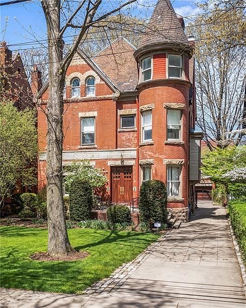 Amazing home in top notch conditon! Step through the vestibule into its grand entry to admire parquet floors & boxbeam ceilings. 'The turret'. Formal LR & adjacent casual family rm both w/ gas fps. Stunning DR has built-in hutch with wine fridge. Amazing kitchen across back of house: marble tiled backsplash, pendant lights, banquette seating, mudroom access. New carpeting on stairs & 2nd flr. Original stained glass window at landing. 2nd floor suite with huge bedroom, closet & bath including clawfoot tub + separate shower & 2 addt'l brs, laundry & hall bath. 3rd flr has 2 more bedroom & full baths + office & readily accessible storage. Outdoor urban oasis! Remote-controlled gate at driveway leads to detached 2-car garage & breath-taking private enclosed yard: mature perennials, uplighting, new expanded rear deck with built-in gas firepit, fans, grill & sunken hot tub. All a short walk to Walnut St shops, Carnegie museums, PITT & CMU, UPMC hospitals. 240v car charger!
