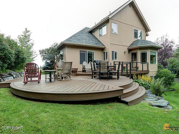 Unbelievable park like setting with views from the front of the inlet and Mt. Susitna. You'll love the detail of the landscaping and water features along with the beautiful trex decks to enjoy the sun throughout the day. Lower level can easily be a MIL area - plus there is a theatre room to enjoy your movies. Radiant heat on lower and main level floors. Azurite granite countertops, pantry, SSappliances in kitchen, Many custom features throughout. 3 Bedrooms and 2 baths on top floor plus bonus room over the garage. 5th Bedroom on main living area. You will be impressed.