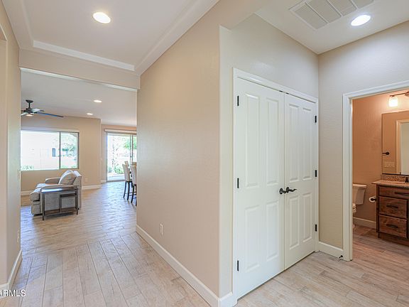 Partially FURNISHED CHOLLA model Villa on PREMIUM LOT w/Greenbelt view & no home behind. Kitchen features alder cabinets with knobs, tile backsplash, quartz counters, SS appliances, soft closing drawers, roll-out shelves, built-in trash bin, under cabinet & pendant lights. So many upgrades from the 6'' x 36'' tile (carpet in the master bedroom & closet only), Granite vanities, master tiled shower, H2O Whole House Water Filtration System, Somfy remote blinds in dining area, great room, master bedroom, 5 1/4''' baseboards, custom fans & lighting throughout. Garage has epoxy flooring. Step out back to the spacious covered patio w/extended pavers where you can relax & enjoy the beautiful view of the greenbelt. The HOA takes care of the exterior of the villa, including the landscaping.