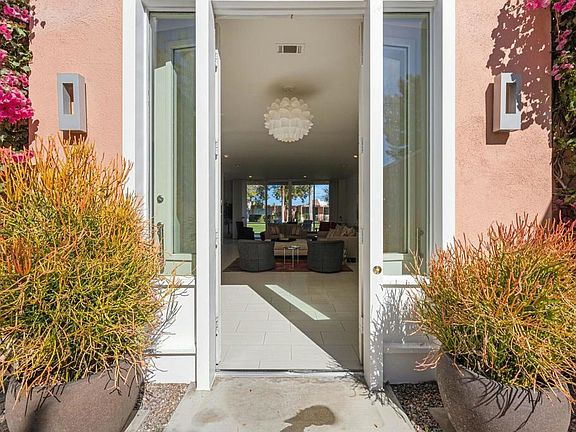 Presented in Beautiful Marrakesh Country Club, this Hollywood Regency Villa in a rare corner location features classic white wrought iron gates which open to a serene courtyard with walled greenery and pathway leading to the iconic Marrakesh double front doors. This D-plan, the largest in Marrakesh at 2,427 sq. ft., offers 3 bedrooms and 3 bathrooms in a beautifully updated design. The stunningly modern kitchen features a sleek breakfast bar, while generously sized bedrooms--with walk-in closets--offer ideal separation for privacy. The primary suite, overlooking the golf course, serves as a tranquil retreat with a luxurious spa-inspired bathroom, freestanding soaking tub, and windows framing lush greenery for a true Zen escape. Floor-to-ceiling glass flood the home with natural light and showcase fairway views of the north-facing 7th hole and spacious leisure terrace. Additional highlights include an ensuite guest room, a versatile office or den flex space, a stylish powder room, and an attached garage--elevating desert living to its finest. Marrakesh is a boutique country club with an ideal central valley location amongst a few of the desert's finest private clubs. Amenities include 18-hole private executive golf course, tennis, pickle ball, 14 pools and spa, a fitness center, and an active and newly-remodeled club house with fine dining. Marrakesh is near famous El Paseo with all of its elegant boutiques, restaurants, art galleries and coffee houses.