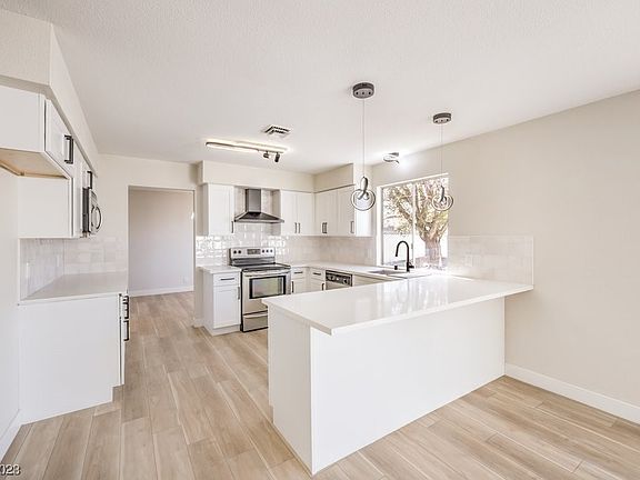 Beautifully remodeled, two-story home with small RV parking and large backyard. Quick access to interstate 93 and 15! Centrally located minutes from both the entertainment, shopping & casinos of downtown Las Vegas and the Las Vegas Strip! Spacious kitchen with garden view, new white shaker cabinets & countertops, custom tiled backsplash, stainless steel appliances, and breakfast bar with sitting area. Bathrooms have been fully upgraded with custom vanities with framed mirrors, lighting, and modern tiled showers with niche. Home has gorgeous interior finishes, modern light fixtures, painted accent walls, laminate wood flooring and plush carpet throughout.