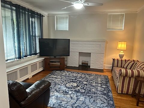 Spacious 3 Bed/1 Bath first floor apartment. Hardwood floors. Separate living room and dining room. Kitchen with walk in pantry and updated stainless steel appliances including gas stove, dishwasher, microwave and refrigerator. Front porch. Back yard for relaxing. Area for gardening if desired. On site laundry. Street parking (two car garage may be available for rent in the future). Heat included. Window AC unit included.