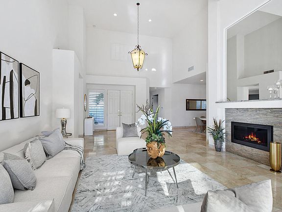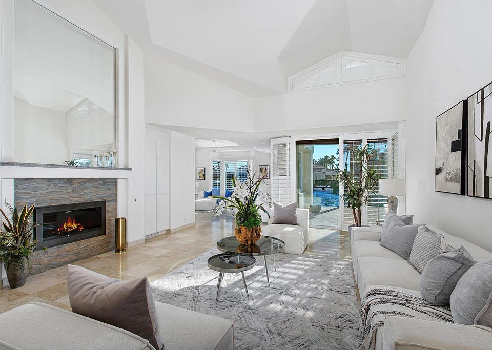 Discover the rare magic of lakefront living surrounded by desert beauty. This 3-bedroom, 3-bath custom home is one of 110 homes on the lake in the gated community of Lake La Quinta perfectly blends elegance, comfort, and resort-style relaxation.Step through a custom entryway and into a bright, open great room framing breathtaking views of a 26-acre private lake and its glistening water feature. The high ceilings and indirect lighting create a luminous, airy atmosphere throughout the home.Designed for both entertaining and everyday luxury, the chef's kitchen features slab granite countertops, travertine flooring and an adjacent wet bar--ideal for hosting friends and family. The seamless indoor-outdoor flow extends to an infinity pool with brilliant blue accent spa. Interlocking pavers connect to lakeside sitting areas where you can unwind, dine al fresco, or wave to neighbors who may pass by on their electric boats for a sunset cruise.The spacious primary suite offers direct access to the pool, spa, and private dock--a serene retreat with a soaking tub, double-sink vanity, separate shower, and a large walk-in closet. Each guest bedroom includes its own private bath, ensuring comfort and privacy for all.Beyond your home, enjoy exclusive community amenities--tennis, pickleball, bocce ball, a scenic park, BBQ pavilion, and a heated pool--all within a 24-hour guard-gated neighborhood offering unmatched peace of mind. A three-car garage with generous storage completes this stunning desert oasis. The 3rd car garage may be converted to an attached casita.Lakefront luxury. Desert serenity. Resort living every day. Make this extraordinary home your next chapter--schedule your private tour today!