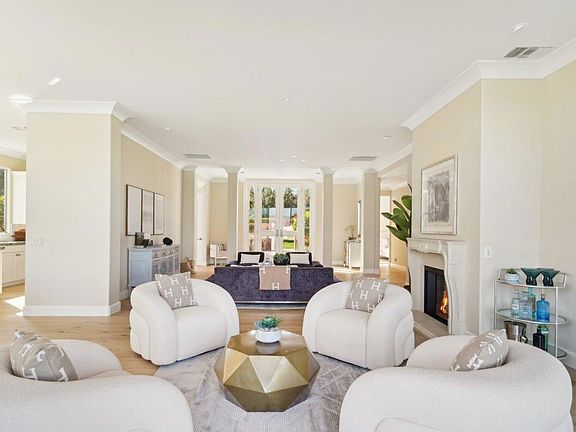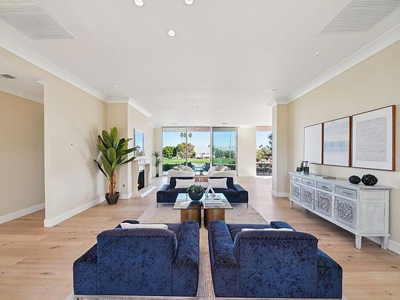 This stately John Elgin Woolf Hollywood Regency-style gem is perfectly positioned on one of the finest lots in Marrakesh. Boasting 10-foot-high ceilings and a stunning wall of floor-to-ceiling sliders, the home seamlessly extends to a spacious covered patio spanning its width. From here enjoy breathtaking views of a serene lake with a fountain, the action on the 7th green, and magnificent sunsets--all with no neighboring homes directly in sight. Expanded and meticulously remodeled with permits in 2014-2015, this desirable C Plan now offers 2,550 square feet of elegant living space, including 3 bedrooms and 3 bathrooms. Sunlight floods the interior from its prized northeast corner location, while large picture windows frame sweeping views of the majestic East Mountains from the dining area, kitchen, and third bedroom.Thoughtfully designed with impeccable finishes, the home features beautiful white oak flooring, grand crown molding, tall baseboards, a cozy fireplace, and high-quality dual-pane windows and doors. The luxurious baths are adorned with timeless white Carrara marble. The enlarged chef's kitchen is a dream, complete with Shaker cabinets, exquisite light-green stone countertops, a six-burner gas cooktop, warming oven, and premium KitchenAid stainless steel appliances.The primary suite is a tranquil retreat, offering a generous walk-in closet and serene lake views. Situated on an elevated lot, the home enjoys enhanced privacy, with ample distance from neighboring properties. A community pool is conveniently located just across the street.Recently refreshed, the entire home and garage have been newly painted, while the marble and wood floors have been professionally refinished. Move-in ready and meticulously maintained, this exceptional home is a rare find in Marrakesh.