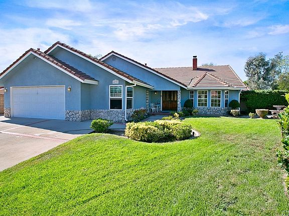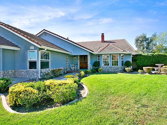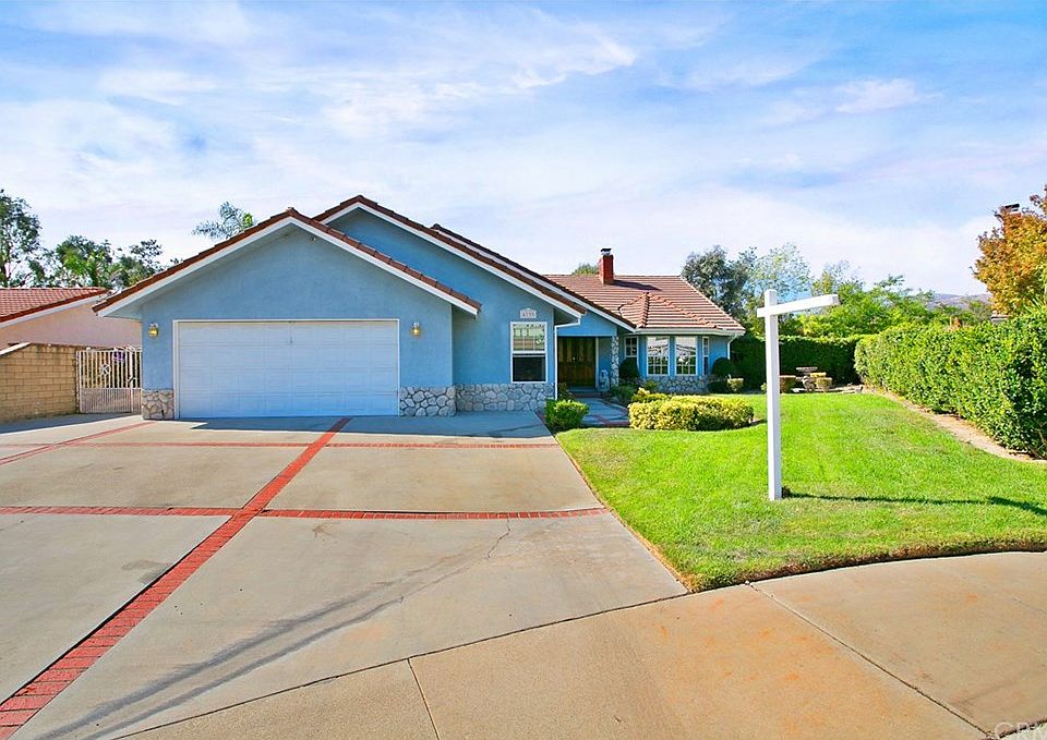 SINGLE STORY POOL HOME WITH AN OPEN FLOOR PLAN. Situated on a quiet cul-de-sac north of Baseline Rd. in La Verne, this home offers a green front lawn, brick ribbon driveway, gated RV parking, planters, a front patio and double door entry. Through the front doors is a tiled entryway opening to vaulted ceilings in the living room which offers carpeted floors, an adjacent formal dining room with a chandelier and glass french doors to a back patio. The family room features a brick fireplace, vaulted ceilings with exposed beam ceilings, a sliding door to the backyard with a view of the pool and is open to the kitchen. The spacious kitchen features updated cabinets, corian countertops, black appliances, recessed lighting, a mobile island, built-in work station, extra storage, a slider to the backyard and seating at the kitchen counter. The master bedroom also features vaulted ceilings, a sliding door to the backyard with a view of the pool and a spacious master bathroom. The master bathroom offers dual sinks, a private shower, tub, skylight and a walk-in closet. Three additional bedrooms, a full hall bathroom and a laundry room inside make this the perfect single story. The backyard features a pool and spa, a grass area with an in ground pond with spillway and a bridge, patio areas, beautiful views of the mountains and a gated RV parking area. Camera security system & newer dual paned windows throughout.