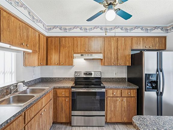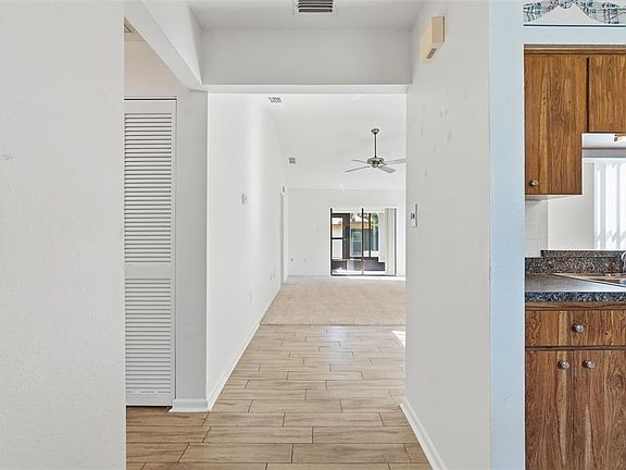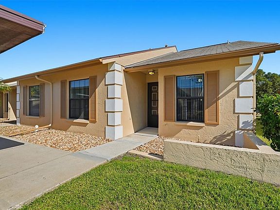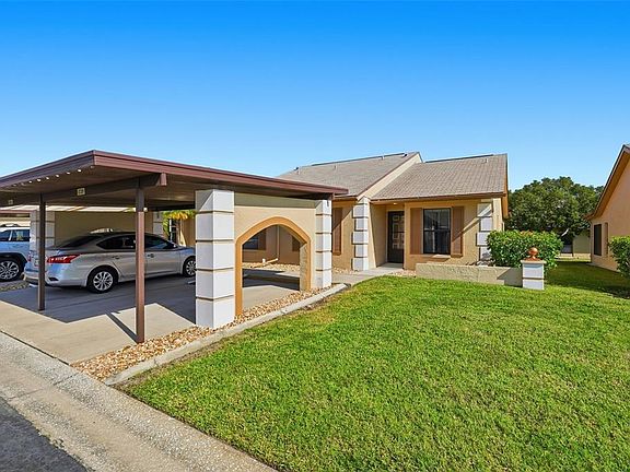 Welcome to this charming 2-bedroom, 2-bathroom villa-style condo located in the desirable 55+ community of Bay Park Estates in Holiday. This end-unit home offers exceptional privacy and convenience in a bright, open layout perfect for easy Florida living. Step under your covered carport and walk right into an inviting open floor plan. The kitchen sits to your right, featuring a stainless steel refrigerator and stove, an abundance of cabinetry, and a convenient coffee bar or prep station. The living and dining room combo boasts vaulted ceilings, creating a spacious, airy feel, and natural light flows throughout the home. Ceiling fans in every room ensure comfort year-round. The split floor plan offers ideal privacy. The primary bedroom includes a large walk-in closet with built-in organizers and an ensuite bathroom featuring a generous vanity, glass-enclosed shower, and a linen closet. The second bedroom is comfortably sized, with the guest bathroom offering a shower/tub combo. Enjoy the convenience of an in-unit washer and dryer closet, and relax on the enclosed back lanai, perfect for enjoying peaceful views and Florida weather any time of year. An additional storage closet on the lanai provides even more functionality. Roof maintenance is handled by the HOA, giving you peace of mind. Bay Park Estates offers wonderful amenities, including a community pool and shuffleboard courts, and is ideally located close to shopping centers, grocery stores, and dining options. Move right in and start enjoying the relaxed, maintenance-free lifestyle you’ve been looking for! Schedule your showing today!