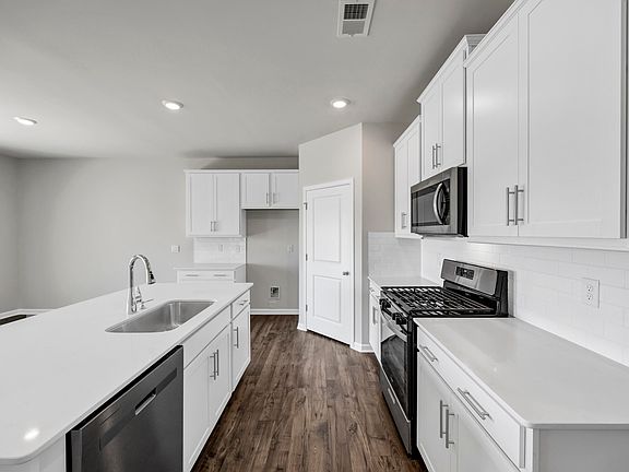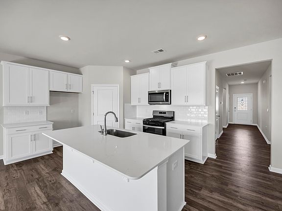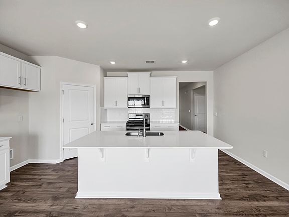 Floating islandCorner lotSpacious corner lotTile backsplashGray shaker-style cabinetryWhite quartz countertops