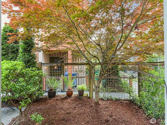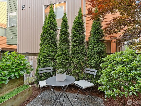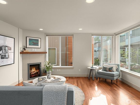 Well-maintained end-unit with bonus parking space (in addition to its one-car garage), just a mile from the new light rail station, in an established community. Enjoy lively pickleball courts, kayaking, paddleboarding, soccer and more at Bitter Lake Park, just one block away. Built in an era when they still used real wood for flooring. Office/bedroom down. Kitchen w/eating bar, pantry, powder room and living/dining in the middle level. Primary suite w/private access to bathroom plus convenient laundry and guest bedroom up. Brazilian cherry wood floors. Electric fireplace. Rentals and pets welcome. Transit out front and say hello to the brand spanking new Greenwood Trader Joe's. No HOA (self-governing).