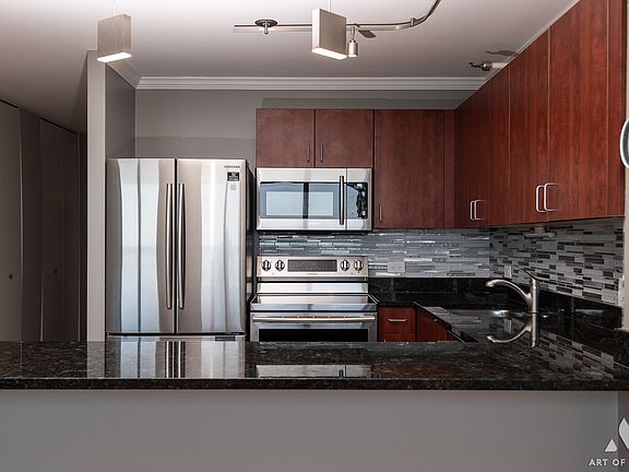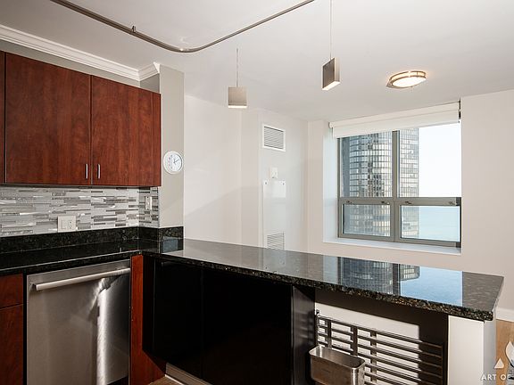 Unobstructed navy pier viewsOpen unitGranite countertopsStainless steel appliancesTiled backsplash