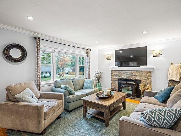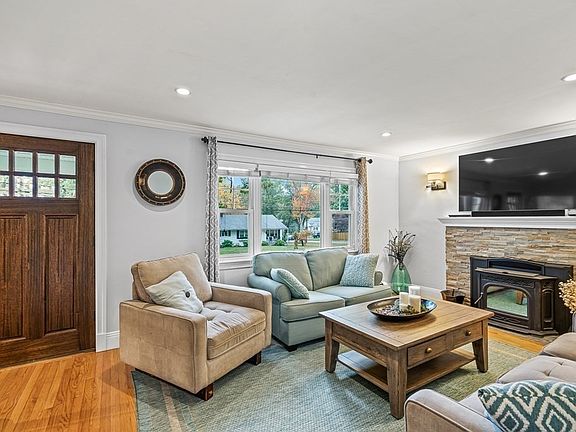 Absolutely charming, totally updated cape with very private wooded backyard and the convenience to shopping and town center. You will fall in love with this open shaker white kitchen with large center island, granite counters, white backsplash, pantry and stainless steel appliances. Loads of cabinets and open to dining room with beautiful hardwood floors. First floor bath with tile surround, Kohler faucet and pedestal sink. Convenient first floor bedroom or home office. Family room with pellet stove, crown molding and picture window. Upstairs there are two good size bedrooms with hardwood floors and an updated full bath with tile surround. Gas heat. Town sewer and water. Brand new tankless water heater. One car detached garage. Nothing to do but move in. Updated at this price, unbelievable!!