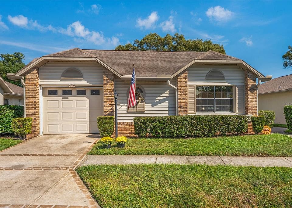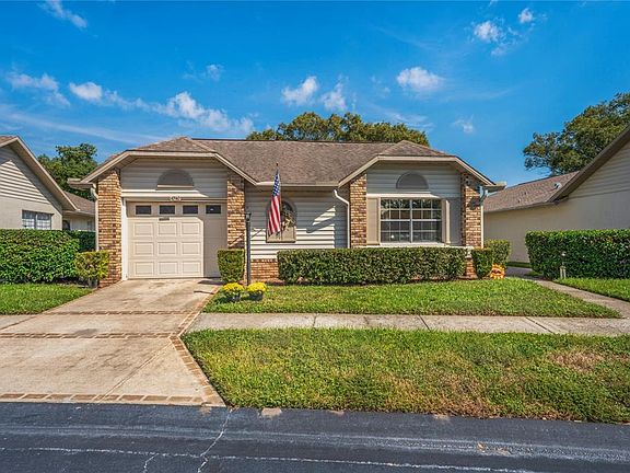 Beautifully Maintained 55+ Villa in Heritage Lake! Move right into this fully furnished, turnkey 2BR/2BA/car garage villa offering 1,300+ sq. ft. of comfortable, maintenance-free living. Featuring a bright open floor plan with soaring ceilings, ceramic tile flooring, and an inviting living-dining area with electric fireplace. The kitchen offers ample cabinet space and a sunny breakfast nook surrounded by windows. Split-bedroom layout for privacy plus a versatile den/office. Spacious primary suite with cathedral ceiling, dual closets (one walk-in with custom built-ins), and a remodeled ensuite with granite dual sinks, glass shower, and modern tile. Guest bedroom also includes an electric fireplace. Heritage Lake is an active 55+ community with resort-style amenities—heated pool/spa overlooking the lake, clubhouse, billiards, tennis, pickleball, bocce, shuffleboard & numerous social activities. HOA covers roof, exterior, lawn, pest, cable, internet, trash & common areas. Conveniently located near Trinity shopping, dining, and medical facilities—just 29 miles to Tampa Intl Airport & close to Gulf beaches. No flood zone! Schedule your private showing today!
