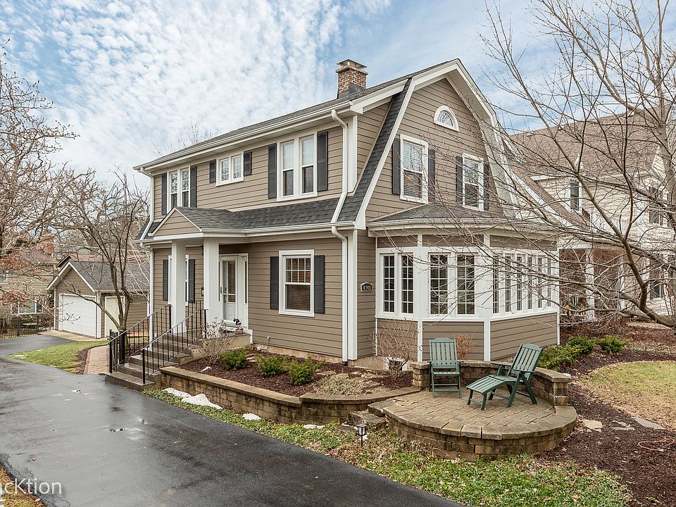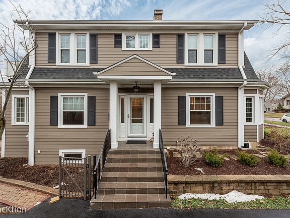 This 1927 Dutch Colonial is full of charm and up-to-date classic features. Situated on a historic brick street, this stylish home is clad in beautiful James Hardie siding installed with other recent updates such as 50 new windows, new exterior doors, and aluminum gutters, soffits, and fascia (2014). A stone front patio offers a shady place to relax. The aluminum fenced-in back yard and mature trees offer privacy for the patio (2015) with space for shooting hoops and easy access to the detached two-car garage (new in 2001 and with enough power to charge your EV). Other outdoor amenities include new landscaping and a blacktop driveway (2018). Additional outdoor living space is provided via a Trex roof deck with pergola and retractable sunshades. The steps to the back porch are also Trex (2018). At the front porch, you'll be greeted by blue stone steps and an arts and craft style front door. Inside, the entryway leads to a spacious living room with an updated, remote controlled gas fire place, built in shelves, and window seats that encase the radiators for hot water heat (new boiler in 2007). And you'll also be cool in the summer with the space-saving central air system installed in 2001 (new air handler in 2016). The main floor also includes a dining room, a sun room, a half bath, and a kitchen that was completely remodeled in 2015. Upstairs, you'll encounter a large primary bedroom with one walk-in and one smaller closet. The second bedroom includes a loft for extra living space. Access to the roof deck is from the third bedroom. The full bath is also upstairs, with both bathrooms being completely remodeled in 2015. This lovely home has refinished white oak hardwood floors except in the bathrooms, which are ceramic tile. The washer and dryer are in the professionally waterproofed, walk-out basement, which also includes a radon mitigation system, sump pump, new main sewer line (with outside cleanout), and new copper water line. Other safety features include wireless smoke and carbon monoxide detectors. One block from Prince Pond, this desirable move-in ready home is walking distance to all three public schools, St. Joseph's, downtown Downers Grove and is in a splendid location for anyone wanting to make Downers Grove their home.