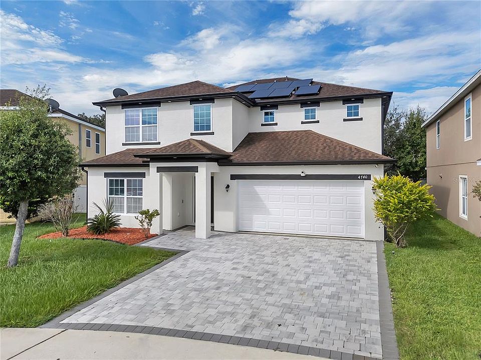 This spacious two-story residence in the Hammock Trails community features 5 bedrooms, 3½ bathrooms, and over 2,800 square feet of living space. Built in 2015, the home offers a layout that brings together the kitchen, dining, and family room—perfect for both everyday living and entertaining. The first floor includes a private master suite, while a second master suite upstairs is complemented by a generous loft that can serve as a game room, media room, or versatile living area. Interior finishes include ceramic tile and laminate flooring, and the kitchen is fully equipped with modern appliances, including a Smart Samsung AI Family Hub™ refrigerator with AI Vision Inside™. Recent upgrades by the seller enhance both style and functionality, including a new paver driveway and entry, a beautifully updated kitchen with Calacatta quartz countertops with a waterfall island, a newly added covered lanai with pavers, and fresh interior and exterior paint. Additional features include a whole-home water filtration system, an under-sink osmosis filtration system, and washer and dryer—all of which convey with the sale. Situated on a 0.17-acre homesite, the property also offers a two-car garage for added convenience. Ideally located in Kissimmee’s Hammock Trails neighborhood, this home provides convenient access to shopping, dining, and Central Florida’s premier attractions—Walt Disney World is approximately 25 minutes away, Universal Orlando about 30 minutes, with SeaWorld and Orlando International Airport also within easy reach.
