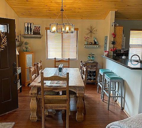 Perfectly maintained stunning Bison Ridge home ready to go! 2 bedroom 2 bathroom gorgeous home with an open floor plan and countless upgrades including: new flooring throughout, granite countertops, tiled back splash, black double sink in the kitchen, light fixtures, gutters, steel front door, A/C, landscaping, stained exterior, and the list goes on! Cozy family room with a detailed fireplace. Large dining area plus a bar to sit at! Laundry room inside plus a large hall bathroom. The master opens up to a small private deck with a beautiful view of tall pines. Fully fenced backyard and a small storage shed attached to the home. ALL furniture/belongings are being sold with the home! Vacation rentals are even an option in this perfect neighborhood! Call listing agent to schedule a showing!