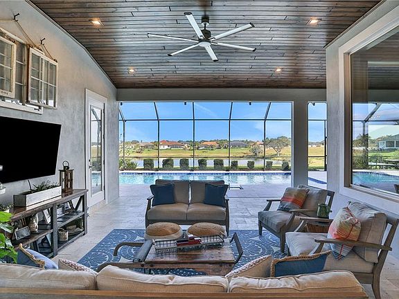 Travertine lanaiCustom grand-scale windowsPrivate officeCovered summer kitchenQuartz countertopsContemporary lightingOverlooks lake winterset