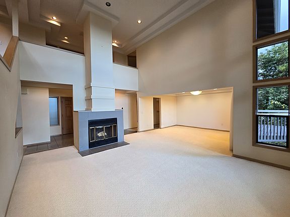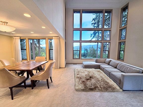 You are greeted by a grand entrance with soaring 18-foot vault ceilings and panoramic views of Lake Washington and majestic Cascade Mountains. Wall-to-wall view windows anchor this magnificent space, anchored by a statement fireplace, flowing seamlessly into the view dining area, ensuring every meal is accompanied by breathtaking views of water and nature.