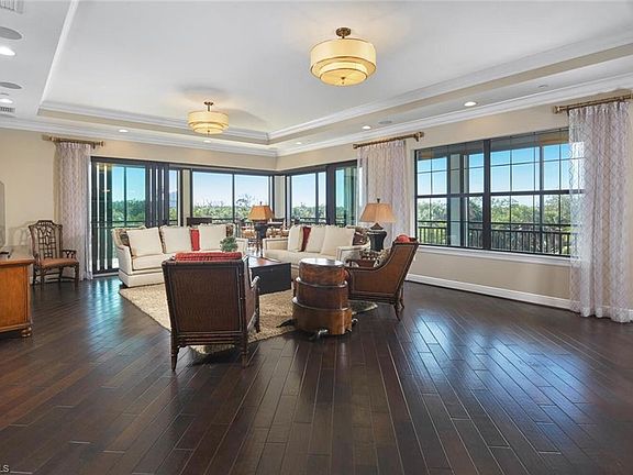 Prepare to be captivated by this exquisite south-facing residence! Private elevator entry leading to an impressive 2900+ square foot open floor plan, this coastal home features 3 bedrooms plus a den and 3.5 baths, ten foot ceilings, rich wood floors....all offered beautifully furnished for your convenience. The award-winning Cielo layout showcases expansive views from the wrap-around lanai, where you can bask in the breathtaking sights of the Colony's lush emerald-green fairway and preserve land. Negative edge sliders seamlessly merge both interior and exterior lanai space for entertainment and enjoyment...it's like a single family home. The heart of the home is a magnificent kitchen, complete with a gas cooktop and adorned in a soft, neutral color palette, perfect for entertaining. Built to the highest hurricane storm code, this residence ensures peace of mind alongside comfort and style.The Colony presents the best possible lifestyle with dining membership to The Bay Club, private beach park, a huge tennis, canoeing/kayaking, sailing club, bocce, and the latest sensation...pickle ball! Located within minutes of shopping, restaurants, sports arenas, performing art centers, world-renowned beaches, and SWFL international airport.
