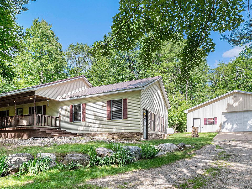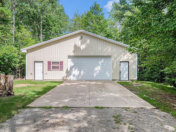 2004 ranch home with pole barn set in the deep northwoods of Lakes of the North. Tons of privacy, all you'll pretty much hear are the sounds of nature. Ranch features 2x6 spray-foam walls, two living areas, a long covered porch, vaulted pine ceilings, solid pine interior doors, hardwood & tile floors, & a decorative pine tree trunk in the open floorplan. The 40x60 pole barn has a 9' door, 10' sidewalls, & 4 ft. center-trusses. 2016 sulfate-lined septic system. Lakes of the North provides resort living with its 18 hole golf course, lounge & restaurant, two swimming & fishing lakes, winter recreation area, campgrounds, horse facilities, & a clubhouse with indoor pools, tennis courts, fitness equipment, & game room. There's also an on-site fire station & airport.