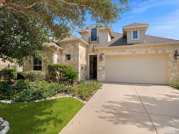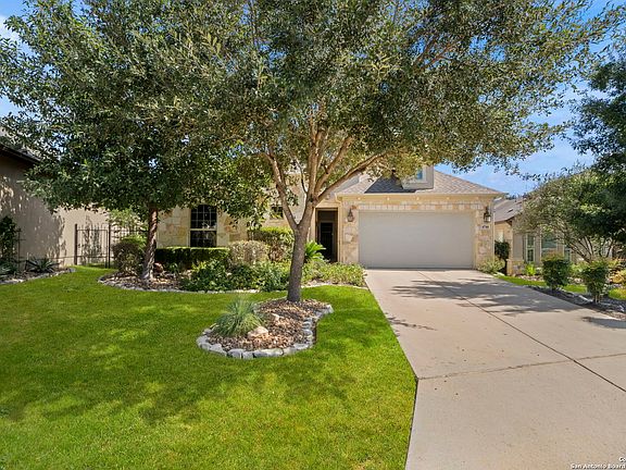 Welcome to this exceptional 3-bedroom home with a private casita, versatile flex space, and upscale finishes throughout, located in the highly sought-after gated community of Amorosa in Cibolo Canyons. Nestled on a premium greenbelt lot with live oak trees and direct access to the scenic walking trails, this single-story residence offers the perfect balance of comfort, style, and functionality. Step inside to discover an open-concept interior with soaring ceilings, skylights, and thoughtfully selected timeless finishes throughout. The main home includes two bedrooms with a flexible space ideal for a home office, study, or secondary lounge-tailored to meet your modern lifestyle needs. The heart of the home is a chef's gourmet kitchen, showcasing granite countertops throughout, custom cabinetry, built-in buffet and a spacious pantry. Thermador appliances, including a built-in refrigerator, 6-burner gas range, and new dishwasher (installed September 2025). The large oven provides space for your cooking and baking creations along with a built-in microwave, and an expansive center island with bar seating-perfect for entertaining. Natural light pours in from skylights and the adjacent dining area, framed by large windows overlooking the tranquil backyard. The inviting living room centers around a striking stone fireplace, ideal for cozy evenings or hosting gatherings. The spacious primary suite is a luxurious retreat, featuring tray ceilings, a spa-inspired walk-in shower, dual granite-top vanities, and an oversized walk-in custom-designed closet. Separate from the main living areas, connected by another large, covered courtyard with an outdoor stone fireplace, the private casita awaits, including a full bath, bar sink, space for refrigerator or wine cooler, and a custom-built Murphy bed-perfect for multi-generational living, guests, or a private studio. Enjoy relaxing on your back deck overlooking the beautifully landscaped backyard with live oak trees, shaded serenity, and direct access to the community trail system. Just beyond the native greenbelt lies the lush fairways of the TPC golf course, enhancing the peaceful setting. Landscaping is maintained by the HOA, allowing for a low-maintenance lifestyle and more time to enjoy the community's top-tier amenities. Residents of Cibolo Canyons have access to two amenity centers: Amenity Center 1: Lazy river, splash pad, Olympic-size pool, soccer field, playground, fitness center, meeting facilities, and on-site HOA staff. Amenity Center 2 (Amorosa): Olympic-size pool, splash pad, fitness center, BBQ grills, and clubhouse. A rare opportunity to own a home that combines thoughtful design, versatile spaces, and the serenity of golf course living-this one is truly a must-see.