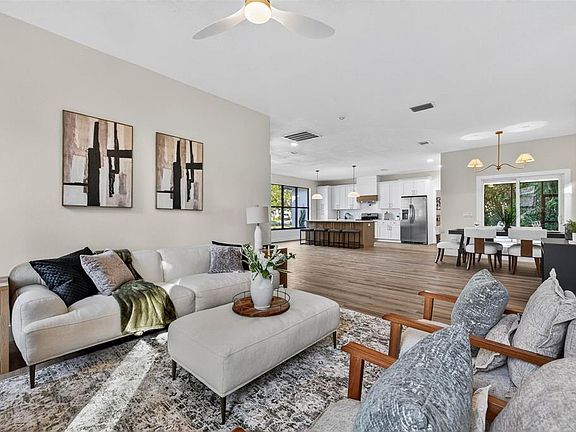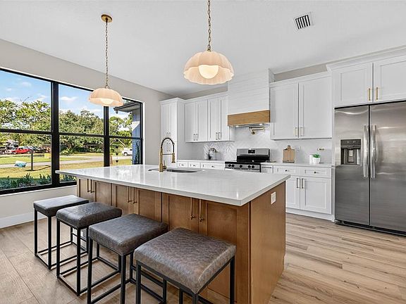 Welcome to this fully renovated 3-bedroom, 2-bathroom pool home spanning over 1,800 square feet in the sought-after Lake Padgett community — ideally situated on an expansive .30-acre lot and zoned for top-rated Pasco County schools. Offering the perfect blend of luxury, comfort, and functionality, this turnkey residence has been thoughtfully elevated with high-end upgrades and designer-selected finishes throughout. Step inside to a light-filled open floor plan that effortlessly blends everyday living with modern elegance. The main living area is warm and welcoming, featuring a beautifully crafted fireplace with stunning quartz detail, framed by modern black-trimmed windows that invite natural light and balance. This open-concept layout flows seamlessly into the kitchen, where custom cabinetry, brass hardware, and a statement wood-accented range hood combine style and function. An oversized, oak accent center island offers seating, storage, and serves as a true gathering place, while luxury vinyl plank flooring runs throughout — tying the space together with warmth and continuity. Each of the three bedrooms includes its own spacious walk-in closet, while the bathrooms offer a spa-inspired retreat with designer tilework, dual vanities, and sleek matte black fixtures. The expansive primary suite is a true escape, featuring double French doors that open to the backyard and an oversized walk-in shower with dual shower heads and arched windows that flood the space with natural light. Step outside to your private backyard oasis — complete with a sparkling pool, a brand-new pool pump and transformer, and fresh professional landscaping. The screened-in lanai is perfect for enjoying a peaceful morning coffee or hosting friends on a breezy Florida evening. Additional upgrades include a new roof (Sept. 2025), updated plumbing, newer A/C, fresh interior and exterior paint, new baseboards and trim, and an irrigation system. Public water and sewer (not septic or well) offer added peace of mind. Enjoy all the perks of Lake Padgett living, including access to the community clubhouse, pool, playground, tennis courts, restaurant/bar, and more. Ideally located just minutes from everyday conveniences and major highways, this thoughtfully designed home delivers the best of modern Florida living in one of Land O Lakes’ most desirable neighborhoods.