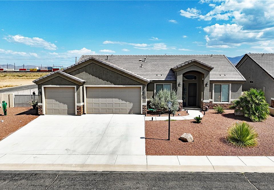 Clean & Move In Ready ~ This 1,921 sf four bedroom, two bathroom home has a split floor plan. The main bedroom is on the north side of the home with dual sinks, deep soaking tub, roll in shower, separate toilet room with high rise toilet and walk in closet. Bedrooms two & three are on the south side of the home and share a bathroom with a single sink, high rise toilet and tub shower combo. The fourth bedroom or office has double doors and sits right off the entry hall. Open floor plan, with lots of windows, gas fireplace, wood look porcelain tile floors throughout, cool gray & blue paint tones, hand trawled walls, crown molding, beadboard doors, ceiling fans and window blinds. Kitchen has stainless refrigerator, dishwasher, microwave, five burner gas range with griddle, deep single tub sink, walk in pantry, granite counter tops and tons of prep space with the 11 foot long breakfast bar island. Laundry room has gas or electric hookups, upper cabinets, washer & electric dryer. Three car attached garage with eight foot tall doors, auto openers, gas water heater, soft water system and a whole house air filtration system in the attic. Nice big corner lot with block wall, 11.5 ft wide RV gate, tile roof, front security screen, covered rear patio with extended concrete and natural gas stub out for a grill. The Ranch at Long Mountain is a Clean, Walkable, Site Built Homes Only, Subdivision with a $220.00 a year HOA that is used to maintain the common grounds and park. 4744 N. Old Ranch Lane, Kingman AZ.