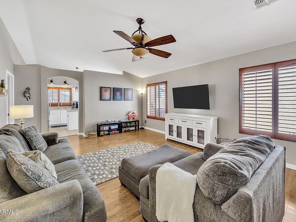 Come see this beautiful home in Ahwatukee Foothills! A large, open living room with vaulted ceilings will invite you into the home. Beautiful shutters throughout the home give a cozy, charming feel and compliment the warm wood laminate floors. New water heater (2025), and Newer water softener (2023). Functional Kitchen has an island for additional prep space, clean white upper cabinets (2019), stainless steel appliances, new kitchen stove (2023), and a pantry. The master bedroom has a walk in closet and full bath. You will find a landscaped backyard with grass and gravel/rock. Nice, covered patio to relax and entertain company. Garage has built-in cabinets and great workspaces. This location is ideal located close to schools, shopping, freeways, and restaurants. Welcome to your new home!