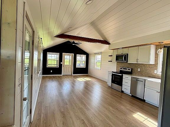 Small loft for storageQuartz countertopsVaulted ceilingHard surface roadWrap around porchesVinyl plank flooring
