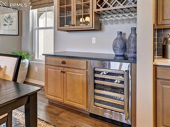 Cordera Model Home. Parade of Homes Winner: Best Kitchen and Best Interior Design features a chef’s kitchen with KitchenAid appliances including a 36” smart commercial style gas range, double oven/microwave combo, quiet-rated dishwasher, disposal and counter-depth refrigerator. The kitchen also boasts full-height wall cabinets with upper glass doors, wainscot cabinet panels on kitchen island and the breakfast area has nook cabinets with glass doors and a slider to the partially covered 31x10 rear patio. There is also under-cabinet lighting. The Formal Dining area has a custom wine bar with wine frig, and tray ceilings with crown molding. There is a custom ledgestone shiplap gas fireplace in the great room, wood ceiling beams, as well as abundant windows to bring in the natural light. Wood beams also grace the entry. Hardwood flooring adorns the main living areas. This home has an 8’ high entry door and 8' main level interior doors. The luxurious primary suite has a 3-sided fireplace, 60x32 soaking tub and a Euro glass enclosure shower, and the closet has cedar accent flooring. There is a half-bath on the main level for convenience. There is also a bedroom tucked around the other side of the kitchen with a full bath, that could work as an office or as a small private bedroom suite. The finished basement has 9’ ceilings, a gorgeous custom wet bar and plenty of niche spaces. One such area has a custom hobby/work space with built-in cabinets and countertops. Other areas easily accommodate a gym space, card table or gaming area and theater space. There are also two additional bedrooms and a full bath in the finished basement. Other upgrades and features include: Full Yard Landscaping, Rear Yard 5' high painted fencing, all 3 garage bays are finished with insulation, drywall, tape/texture/paint, window coverings, full laundry cabinets and sink, air conditioning, upgraded light and plumbing fixtures, soft-close drawers and doors, and much more!