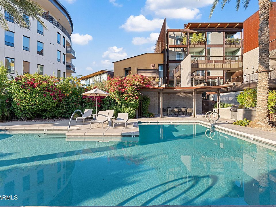 Outstanding value in the heart of Old Town Scottsdale. This sleek 4th-floor lock-and-leave condo offers 2 spacious en suite bedrooms, 2.5 baths with step-in showers, and a versatile flex space currently used as a home office. The light-filled interior features floor-to-ceiling windows with automatic privacy shades, tongue-and-groove ceilings, polished concrete floors on the main level, and Berber carpet upstairs. The gourmet kitchen is appointed with Bosch appliances and a Sub-Zero refrigerator. Recent upgrades include a new washer/dryer (2025) and an updated dual-zone HVAC system. Two garage spaces (P114 & P115) with personal Tesla charging stations are included. Community amenities feature two heated pools, a fitness center, and multiple gathering areas—all just steps from Scottsdale's premier dining, shopping, and galleries. Community amenities feature two heated pools, BBQ areas, a large fitness center, and inviting shared spaces with incredible views. Elevator access to all floors and underground assigned parking.