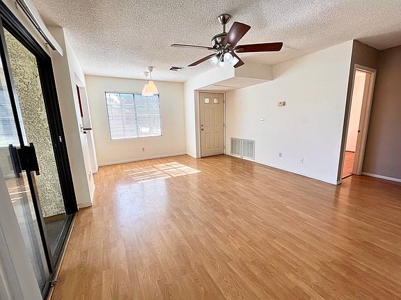 Bright, quiet upstairs corner 2BR/2BA in a gated community. Open layout with dual primary suites, each with a full bath and large closet. Wood-look laminate throughout (no carpet). Covered balcony facing the greenbelt, plus extra storage. Kitchen with granite counters. New central A/C and new in-unit washer/dryer for worry-free living. Covered parking space included with ample guest parking. Community pools. Minutes to the Strip, Allegiant Stadium, and T-Mobile Arena. Close to shopping & dining.