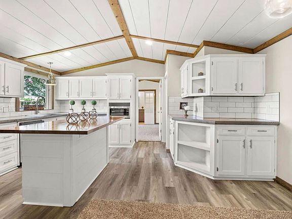 This spacious five-bedroom, three-bathroom home offers 2,460 square feet of comfortable living space. The open design connects the living room, dining area, and kitchen, creating a bright and inviting flow throughout. Vaulted ceilings and vinyl plank flooring add to the sense of space, while large picture windows fill the home with natural light. The kitchen is impressive in size, featuring a generous island, abundant cabinets, and plenty of counter space, along with a large pantry for extra storage.