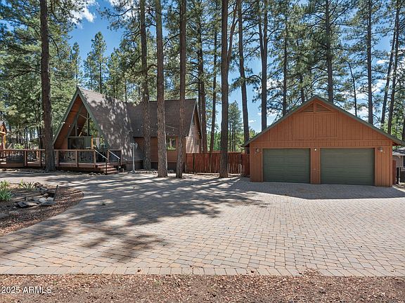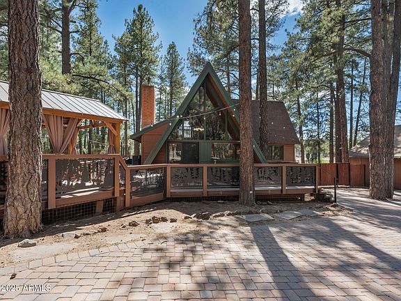 Welcome to one of Munds Park's most exceptional offerings a beautifully updated two-story A-frame nestled among the towering pines on two combined lots totaling over 0.6 acres. This rare double-lot property provides unmatched privacy, space, and modern amenities while retaining the timeless charm of a classic cabin in the woods. Featuring three bedrooms and two bathrooms, this residence has been thoughtfully upgraded to create the perfect blend of rustic elegance and contemporary comfort. The heart of the home is the stunning open kitchen, appointed with rounded granite countertops, a gas stove, farmhouse sink, and built-in wine cooler. Designed for both everyday living and entertaining, it flows seamlessly into the warm, inviting great room and onward to expansive front and rear decks. Here, you'll enjoy serene outdoor living with a fire pit for gathering, a sunken spa tucked beneath a private gazebo, and sweeping views of the surrounding pines. No detail has been overlooked in the updates. A newer heat pump and dual split systems upstairs and downstairs, installed just two years ago, ensure year-round efficiency. The underside of the cabin has been fully insulated, while the backyard fencing has been extended in height for maximum privacy. The paved driveway and yard enhance curb appeal and accessibility, while the newer decks feature custom ironwork railings and screens that showcase craftsmanship rarely seen in the area. Inside, the renovated downstairs bathroom adds a touch of modern refinement, complementing the home's natural character. Completing this property is a spacious detached two-car garage, ideal for vehicles, storage, and all the equipment needed to enjoy mountain living. This property is more than a cabin, it is a retreat that captures the best of Munds Park living: expansive grounds, timeless A-frame architecture, and thoughtful upgrades that elevate comfort and style. Opportunities like this, combining a rare double-lot setting with luxury finishes, are seldom available. Check out this cabin today and experience this extraordinary retreat for yourself!