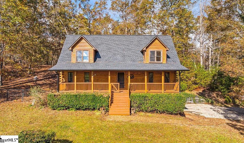 Nestled on 6.5 private acres, this stunning log home offers the perfect blend of rustic charm and modern luxury. A long, gated driveway leads you through a serene setting to your new home, where peaceful living meets thoughtful design. Step inside to discover ½-inch solid hand-scraped hardwood floors and a spacious great room with vaulted ceilings and exposed beams. The kitchen features professional-grade KitchenAid appliances, a double-oven range, granite countertops, a single-bowl stainless sink, and direct access to a back deck that spans the entire length of the home, including a covered portion for year-round enjoyment. The main floor boasts a luxurious owner’s suite with a walk-in closet and a spa-like bath with a freestanding tub, double sinks with marble tops, and a separate custom tile shower. A flexible office space on the main level could serve as a guest room or fourth bedroom, and has an attached half bath. Upstairs, the loft connects two additional bedrooms, each bedroom is oversized and has plenty of storage and closet space. The finished basement offers even more versatility, with a recreation room, mudroom, half bath, storage space, and a two-car garage. Outside, the home truly shines. Enjoy mornings on the expansive covered front porch or watch deer and turkey from your private screened in porch, accessed off the primary bedroom. The property’s crown jewel is a 60x30 detached building featuring concrete block construction, a metal roof, 200-amp service on a separate meter from the home, and a gravel parking area—ideal for a workshop, studio, or storage. With a new roof installed in October 2024 and thoughtful upgrades throughout, this home is ready for its next chapter with YOU. Conveniently located just 20 minutes from Spartanburg, 40 minutes to Greenville, and 28 minutes to Tryon International Equestrian Center, this property is a rare find. Schedule your private tour today and make this dream home yours just in time for the holidays!