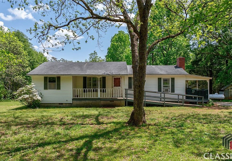 Enjoy the peace and quiet at this charming rural farmhouse, resting on 8.34 wooded acres. Featuring 3 bedrooms, 1 bath, and 1,032 sqft, this cozy retreat offers comfort and peace. Enjoy meals in the dining room with an all brick fireplace. Walk-in pantry with plenty of storage in this convenient kitchen setup. Explore the outdoors, stroll through the woods, or relax on the porch swing. Despite its rural setting, essential amenities are a short drive away - less than 5 minutes to downtown Comer and 25 minutes to downtown Athens. Whether you're a first-time buyer or dreaming of a family compound, this property could be your rural oasis.