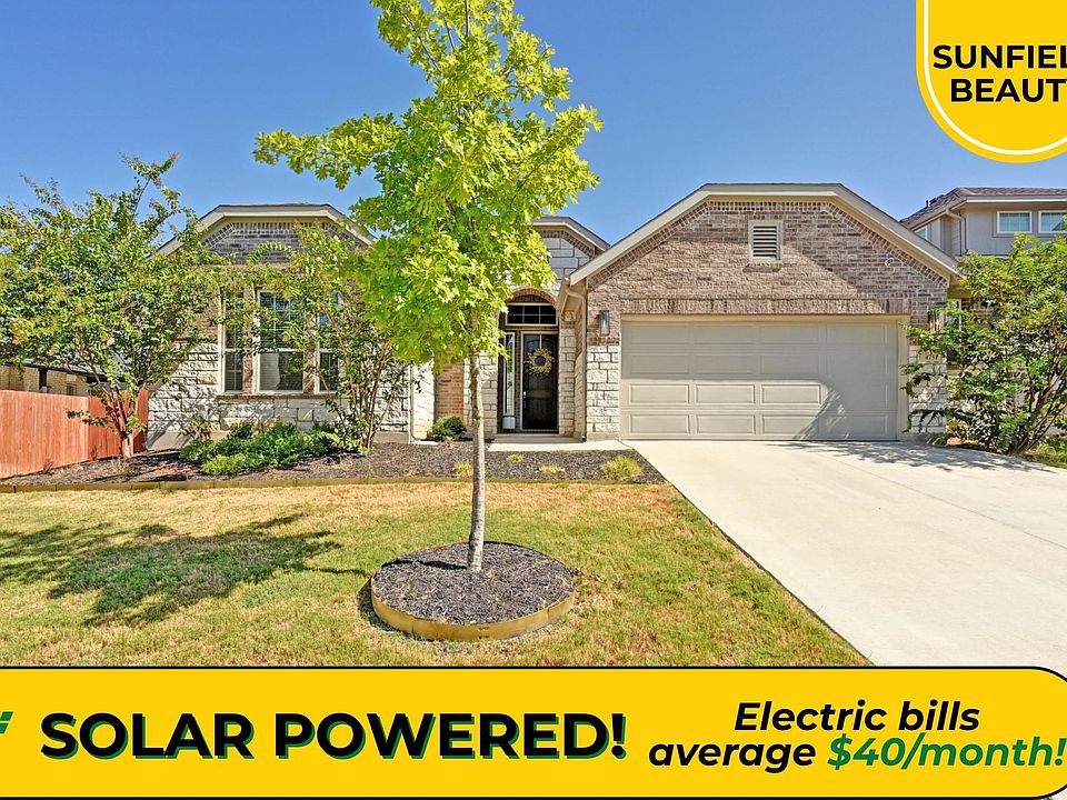 Experience a rare blend of luxury & sustainability in this solar-powered home, where energy efficiency drives bills down to as little as $40 a month an extraordinary advantage that elevates everyday living. Built in 2021 by Chesmar Homes, this 2,550 sq. ft. estate offers refined comfort in every detail. The open-concept design is anchored by a chef's kitchen with a massive granite island, 42-inch cabinetry, subway tile backsplash, and an artful coffee bar. A walk-in pantry and side bar make this space an entertainer's dream. Natural light streams through expansive windows, while soaring ceilings and elegant finishes create timeless sophistication. The primary suite is a true retreat with a tray ceiling, spa-inspired bath, deep soaking tub, glass walk-in shower, and oversized closet. Secondary bedrooms are generously sized, balancing comfort and style. Beyond beauty, high-end upgrades include solar panels, 8 ft. doors throughout, no carpet, a water softener, a water filtration system, two refrigerators, washer and dryer all included! A spacious 2.5-car garage adds extra storage, while four-sides masonry, full gutters, and the home being constructed with the ZIP System wall sheathing moisture barrier, all ensure lasting durability. Outdoors, a large, covered patio and landscaped yard set the stage for gatherings or quiet evenings. Perched in the vibrant Sunfield community, residents enjoy unparalleled resort-style amenities, including an elementary school, walking trails, fishing ponds, an on-site lifestyle activities coordinator, several open-air pavilions, a splash park, a junior-size Olympic swimming pool, & two lazy rivers. Sunfield's prime location offers unbeatable convenience too! Just 3 minutes to IH-35, 5 minutes to the 130 toll road, and mere moments from premier shopping, dining, and everyday essentials. For $3,100 per month, this home offers more than a lease it offers a lifestyle defined by luxury, sophistication, & modern ease.
