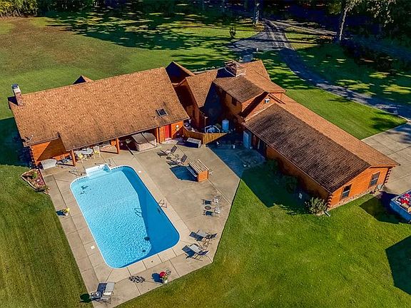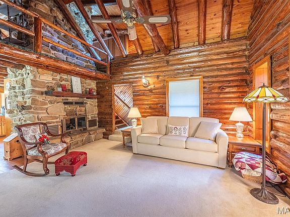 Welcome to your private country retreat- a stunning log-style cabin ranch home nestled on 10 +/- picturesque acres with a peaceful pond and immaculate landscaping. Being at the end of the road, making this totally private. From the moment you arrive, attention to detail and care of this property are evident. The inviting entry opens to a grand great room with soaring 13-foot ceilings, a cozy fireplace, and an impressive 47x24 layout perfect for gatherings. A full wet bar and walkout access lead directly to the in-ground pool and patio area - an entertainer's dream for relaxing and hosting. The adorable kitchen and dining area are surrounded by large windows, flooding the home with natural light and offering gorgeous views of the setting throughout the home. The primary suite features large bedroom and an expansive bath designed for comfort and privacy. Upstairs, you'll find the loft-style bedrooms that create a cozy, cabin inspired atmosphere, while the finished basement includes another large bedroom and plenty of space. Outside, enjoy the best of country living with a barn, detached five car garage, and wide open spaces for recreation. Every inch of this property reflects pride of ownership- you can appreciate how beautiful this property is! Experience the beauty of rural Missouri living, still close to town- where rustic charm meets modern comfort.
