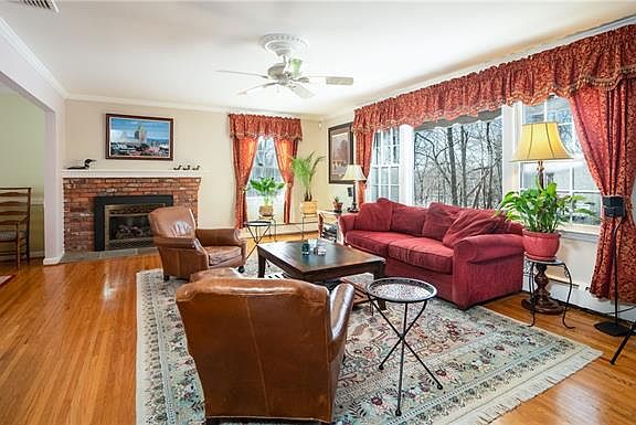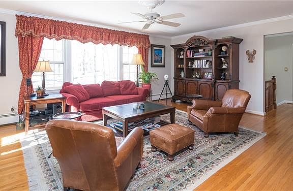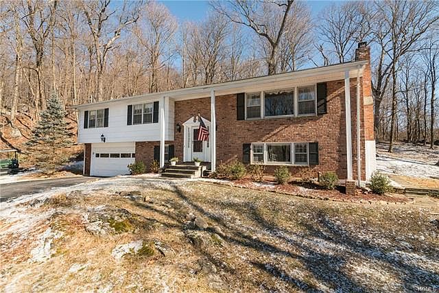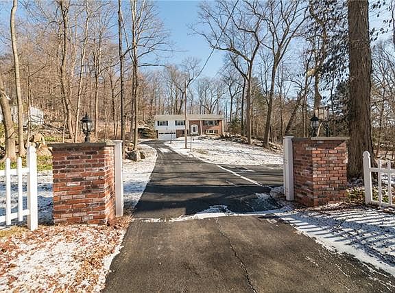 Solid construction! This well-built brick and shingle home with pillared front and white picket fence is set back from the road on almost 2 acres of wooded land and offers useable land and privacy. The home offers 2 gas fireplaces, main level central air, living room w/ picture windows, dining room w/sliding glass doors opening to a large deck and an updated Bilotta kitchen. Main level master bedroom w/ ensuite bath and steam shower, 2 additional bedrooms and updated hall bath. Lower level has family room w/ fireplace and door out, media room w/ 2 storage closets, laundry and hall bath. Above ground oil tank, electric dog fence, rear storage shed, basketball hoop, & ceiling fans throughout make this a tremendous value. Move-in condition, ideally situated near schools, town and train. Priced to sell!