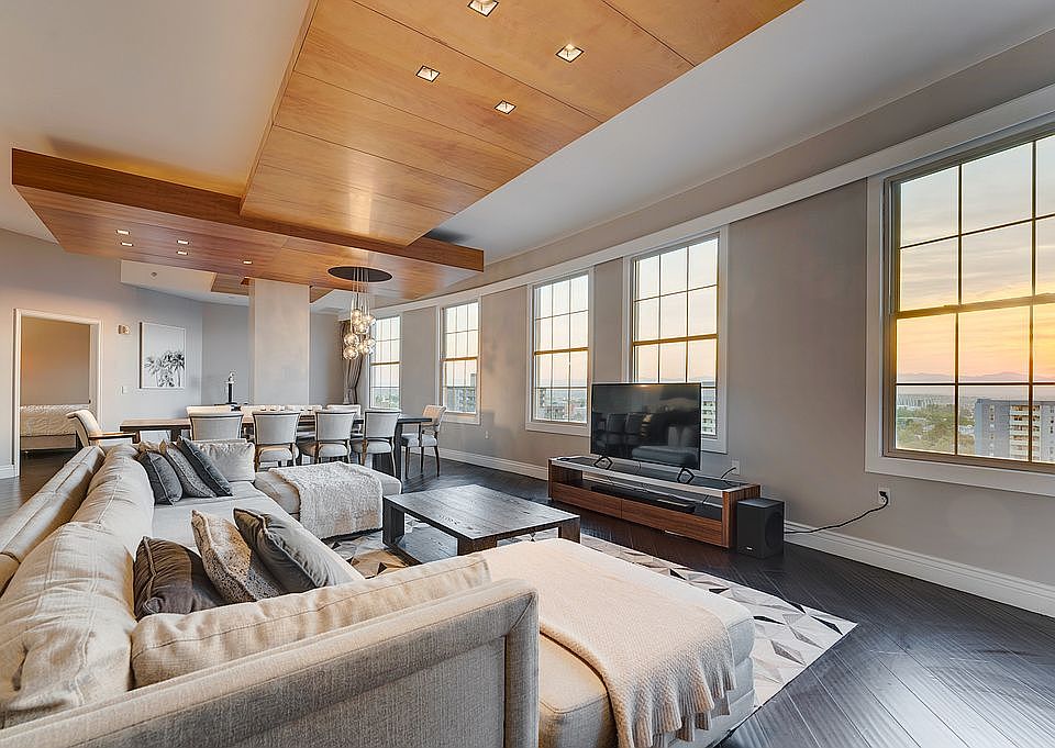 Million-dollar panoramic mountain vistas and natural light flood this open-concept 10th-floor unit through a wall of western-facing windows. 10-foot ceilings, gleaming hardwood floors, recessed lighting, and a dramatic wood-finish bulkhead welcome guests into the spectacular lounge and dining area. Off the dining area with hand-blown glass chandelier is the open kitchen with bar seating, Carrara marble countertops, and separate in-unit laundry. Two spacious ensuite bedrooms on opposite ends of the unit ensure privacy. Each bedroom boasts a walk-in closet with ample storage and a private balcony for sunset barbecues, cocktails, or early morning coffee with a city view. A 18/7 front desk concierge ensures your safety, and 2 dedicated parking spaces and a generous storage unit complete the picture. Conveniently located near public transport in the Golden Triangle and directly opposite the Cherry Creek Bike Path, Belvedere Tower is a biker's paradise. Or, take a short walk to explore Denver's most iconic landmarks, visit one of the many galleries and museums, take in the 25,000 square feet of flowers at Civic Center Park, enjoy world-class public art, and eat, drink, and shop at dozens of eclectic locales. Upscale lock-and-go urban living at its best!